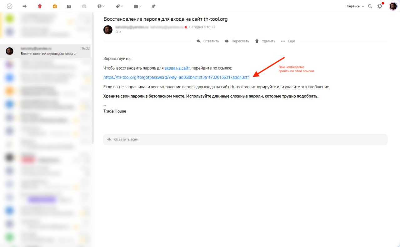 На почту должно прийти письмо с таким содержанием, вам нужно пройти по ссылке.Если письмо не пришло, проверьте папку спам, если письма там тоже нет, то подождите 10-15 минут, возможна задержка на серверах Yandex. Если письмо не пришло по истечении 10-15 минут, проверьте правильность ввода емаил. Если ничего не получается, пишите на емаил: admin@th-tool.by с того емаила, на который вам пришло письмо для восстановления пароля.